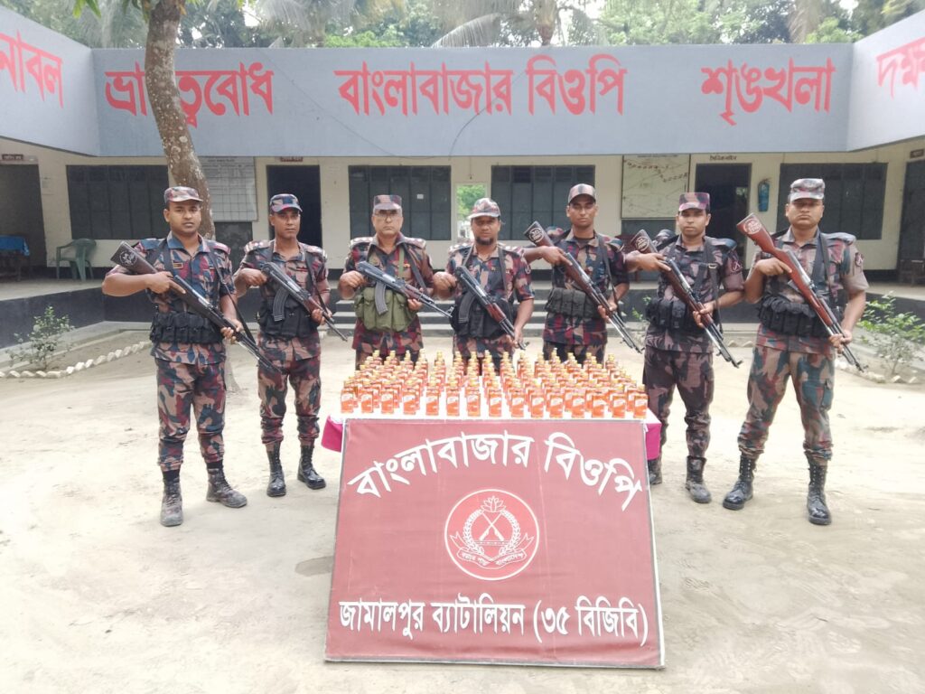 “মাদকের বিরুদ্ধে বিন্দুমাত্র ছাড় নয়” মিছিলকে সামনে রেখে জামালপুর ব্যাটালিয়নের-৩৫ (বিজিবি) অধিনায়ক লেঃ কর্নেল হাসানুর রহমান, পিএসসি এর সার্বিক দিক নির্দেশনায় আজ ১০ এপ্রিল ২০২৫ তারিখ আনুমানিক ০৪ঃ৩০ ঘটিকায় নিজস্ব গোয়েন্দা তথ্যের ভিত্তিতে মাদক বিরোধী অভিযান পরিচালনাকালে জামালপুর ব্যাটালিয়নের-৩৫ ( বিজিবি) অধীনস্থ বাংলাবাজার বিওপি কর্তৃক সীমান্ত পিলার ১০৬৫/১-এস হতে আনুমানিক ১০০ গজ বাংলাদেশের অভ্যন্তরে চর নতুন বন্দর নামক স্থান হতে মদগুলো আটক করতে সক্ষম হয়। জব্দকৃত মাদকদ্রব্য থানায় জিডি করত ব্যাটালিয়ন সদরে জমা করার কার্যক্রম প্রক্রিয়াধীন।
