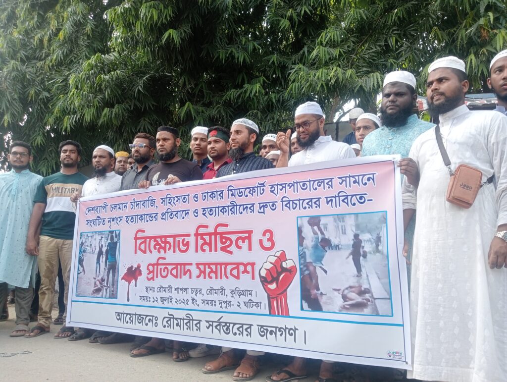 শনিবার (১২ জুলাই ২০২৫) দুপুর ২টায় রৌমারী বাজার জামে মসজিদ থেকে বিক্ষোভ মিছিলটি শুরু হয়ে থানা চত্বর, কাঁচা বাজার ও হাসপাতাল গেট প্রদক্ষিণ করে উপজেলা পরিষদ চত্বরে গিয়ে শেষ হয়। মিছিলে শিক্ষার্থী, ব্যবসায়ী, রাজনৈতিক কর্মী, মানবাধিকারকর্মীসহ বিভিন্ন শ্রেণি-পেশার মানুষ স্বতঃস্ফূর্তভাবে অংশগ্রহণ করেন।