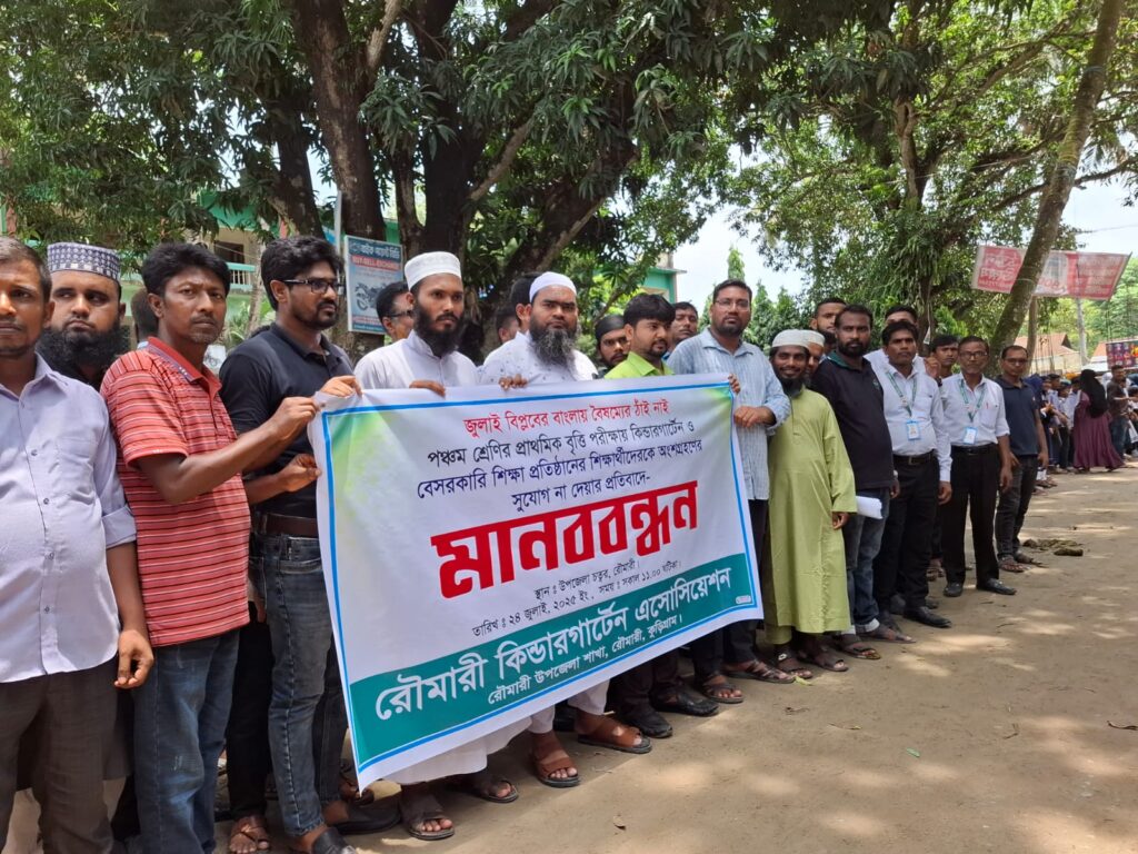 বৃহস্পতিবার (২৪ জুলাই) বেলা ১১ টার দিকে রৌমারী উপজেলা পরিষদের সামনে এ মানববন্ধন অনুষ্ঠিত হয়। কর্মসূচির আয়োজন করে রৌমারী কিন্ডারগার্টেন অ্যাসোসিয়েশন। মানববন্ধনে উপজেলার বিভিন্ন বেসরকারি শিক্ষা প্রতিষ্ঠানের শিক্ষক, শিক্ষার্থী ও অভিভাবক ও সচেতন নাগরিক অংশগ্রহণ করেন।