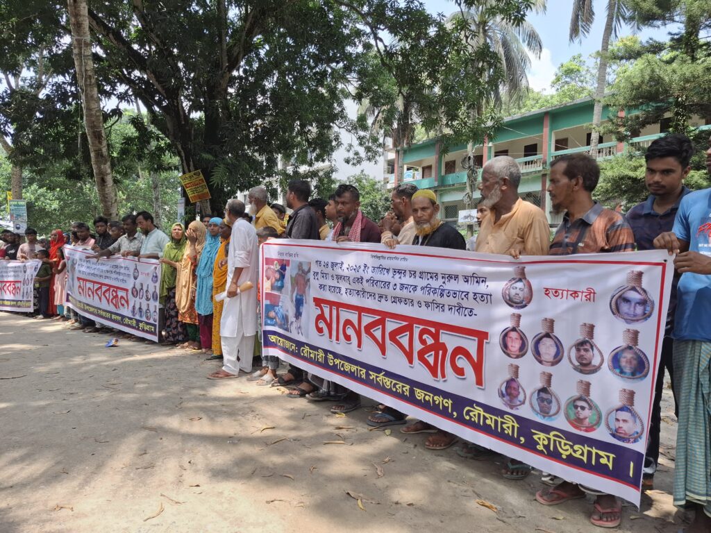 রৌমারীতে ট্রিপল মার্ডারে জড়িত আসামিদের গ্রেফতার ও ফাঁসীর দাবিতে সড়ক অবরোধ ও মানববন্ধন