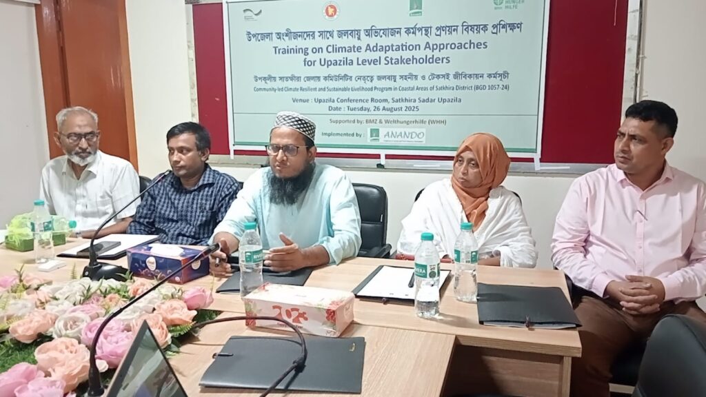 জলবায়ু পরিবর্তনের চ্যালেঞ্জ মোকাবেলায় সচেতনতা বৃদ্ধির লক্ষ্যে সাতক্ষীরায় দাতা সংস্থা বিএমজেড ও ওয়েল্টহাঙ্গারহিলফি (ডব্লুএইচএইচ), জার্মানি’র অর্থায়ণে বেসরকারি উন্নয়ন সংস্থা ’আনন্দ’ এর আয়োজনে “অংশীজনদের সাথে জলবায়ু অভিযোজন কর্মপন্থা প্রণয়ন” বিষয়ক এক প্রশিক্ষণ অনুষ্ঠিত হয়। কর্মশালায় নিরাপদ পানি, স্যানিটেশন, কৃষি ও বর্জ্য অপসারণ, কর্মসংস্থানসহ বিভিন্ন বিষয় নিয়ে আলোচনা করা হয়।