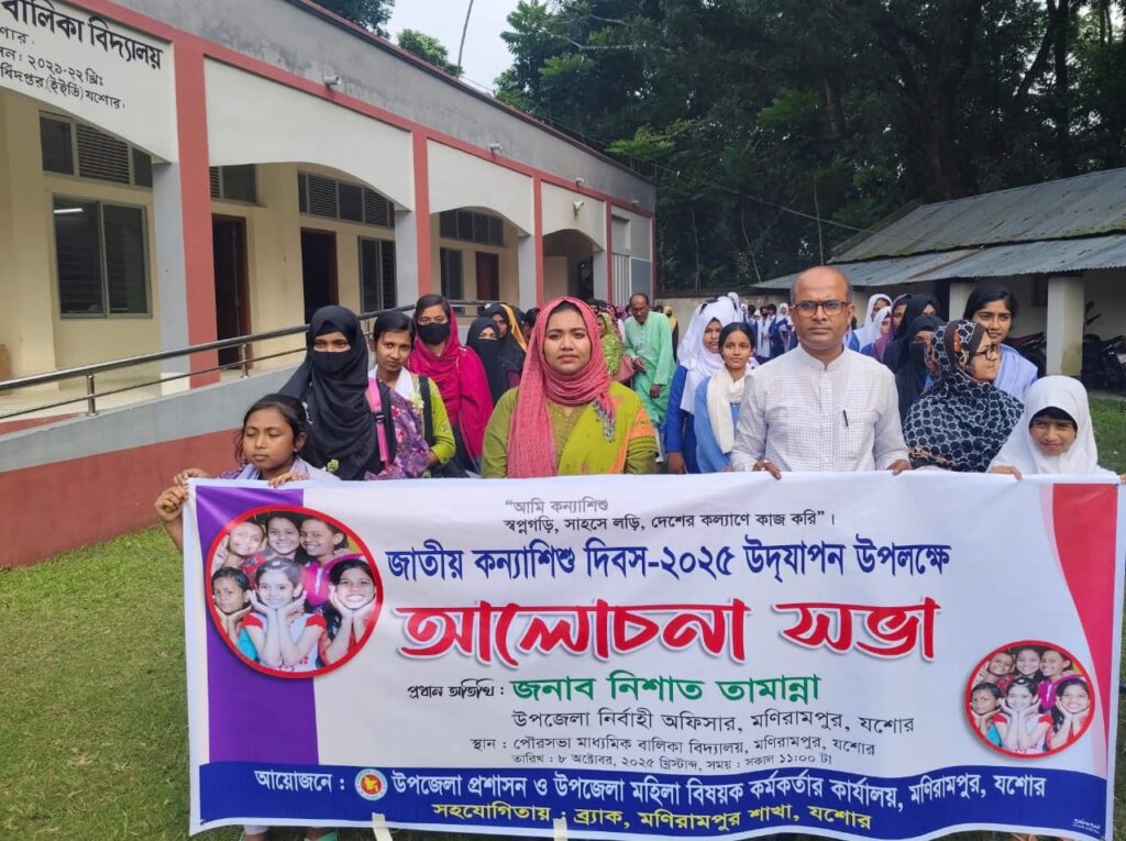 মণিরামপুর প্রতিনিধিঃ মণিরামপুরে যথাযথ ভাবে উৎযাপিত হয়েছে ২০২৫ইং এর জাতীয় কন্যাশিশু দিবস। দিবসটি উপলক্ষে ব্রাক বাংলাদেশের সহযোগিতায় মণিরামপুর উপজেলা প্রশাসন ও উপজেলা মহিলা বিষয়ক কর্মকর্তার কার্যালয়ের যৌথ আয়োজনে অনুষ্ঠিত হয়েছে শোভাযাত্রা ও আলোচনা সভা।