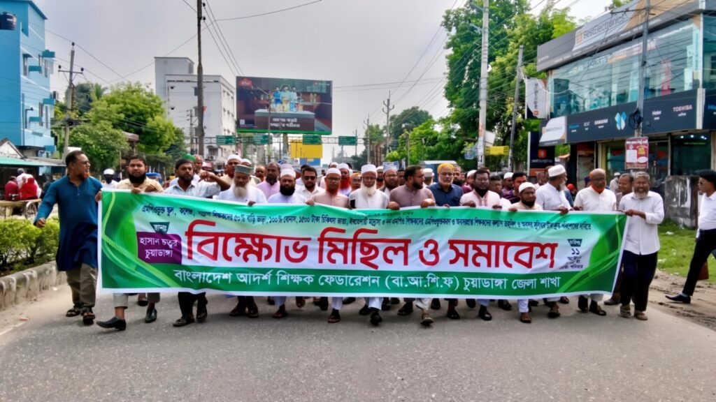 এমপিওভুক্ত স্কুল, কলেজ ও মাদ্রাসা শিক্ষকদের ন্যায্য দাবি আদায়, ইবতেদায়ী মাদ্রাসা এবং নন-এমপিও শিক্ষকদের এমপিওভুক্তকরণ এবং অবসরপ্রাপ্ত শিক্ষকদের কল্যাণ তহবিল ও অবসর সুবিধার টাকা দ্রুত পরিশোধের দাবিতে বিক্ষোভ মিছিল ও সমাবেশ করেছে বাংলাদেশ আদর্শ শিক্ষক ফেডারেশন (বা.আ.শি.ফ) চুয়াডাঙ্গা জেলা শাখা।