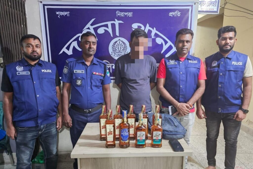 এ সময় তার কাছ থেকে ০৬ বোতল ROYAL STAG SUPERIOR Whisky, ০২ বোতল Mc Dowell’s No 1 LUXURY BLENDER Whisky, ০১ বোতল IMPERIAL BLUE SUPERIOR Whisky, ০১ টি মোবাইল ফোন উদ্ধার করে পুলিশ।