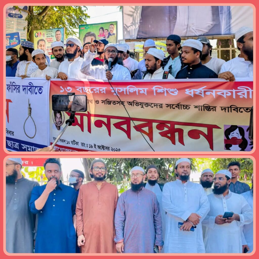 আজ ২১ অক্টোবর (মঙ্গলবার) গাজীপুরের কালিয়াকৈর উপজেলার মৌচাকে হিন্দু যুবক জয় কুমার দাস এবং তার সহযোগী লোকনাথ এবং সঞ্জয় কর্তৃক আশা মনি (১৩) নামের এক শিশু মাদ্রাসা শিক্ষার্থীকে অপহরণ করে তিন দিন আঁটকে রেখে ধর্ষণ করেছে। প্রতিবাদে আজ সকাল ১১ টায় সময় গাজীপুরের জেলা আদালত চত্বরে সর্বস্তরের জনতা আজ মানববন্ধন করেছে। মানববন্ধন থেকে এক কণ্ঠে উচ্চারণ করেছে ন্যায়বিচারের দাবিতে এই ৫ দফা ঘোষণা করেন। আশা মনির ধর্ষক জয় কুমার দাস ও তার সহযোগীদের শাস্তি ফাঁসি এবং মো আতাউর রহমান বিক্রমপুরীকে হত্যার হুমকি দাতা এবং পঙ্কজকে দ্রুত গ্রেফতার এবং শাস্তি প্রদানের জন্য মানববন্ধন করেন।