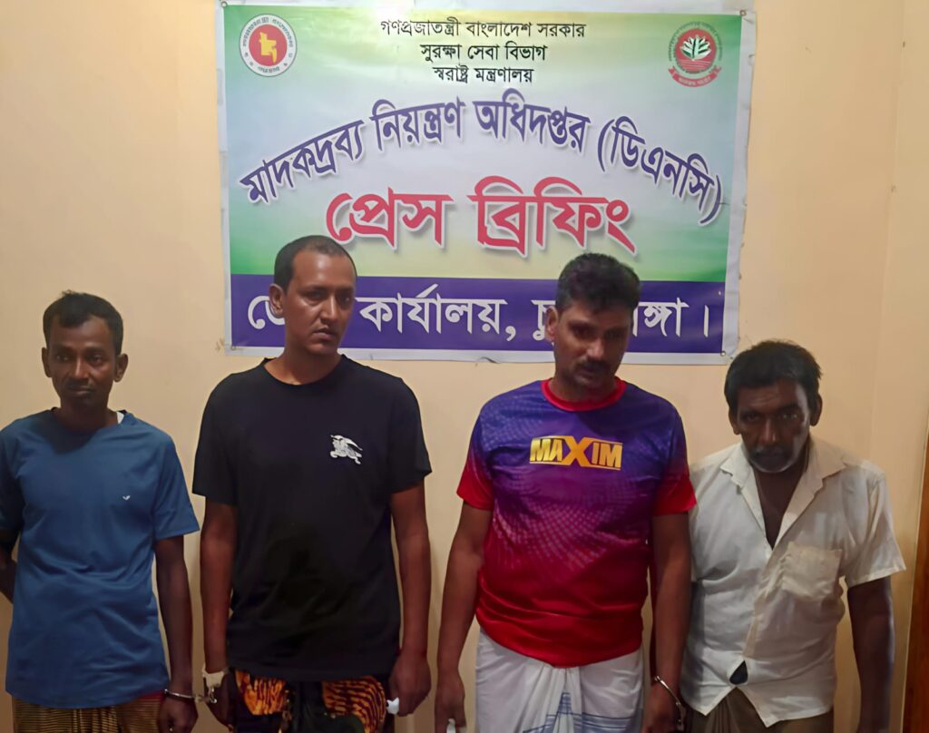 আটককৃতরা হলেন – চুয়াডাঙ্গার মালোপাড়ার শরিফুল ইসলাম, দৌলতদিয়ারের রফিক ও আরোজ আলী, চুনুরীপাড়ার প্রসাদ সরকার এবং খোকন। অভিযান চলাকালে তাদের কাছ থেকে অবৈধ মাদকদ্রব্য বুপ্রেনরফিন ইনজেকশন ও গাঁজা জব্দ করা হয়।