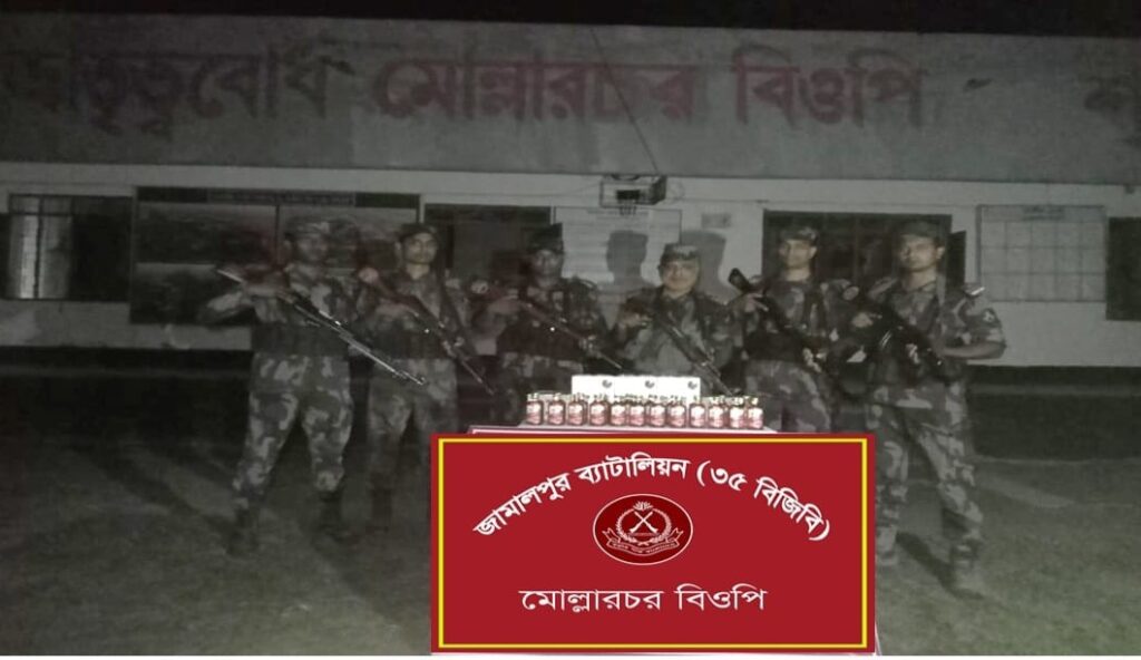 বিজিবি সূত্রে জানা গেছে,  বুধবার ২৯ অক্টোবর আনুমানিক রাত ৯ টার দিকে নিজস্ব গোয়েন্দা তথ্যের ভিত্তিতে জামালপুর ব্যাটালিয়নের (৩৫ বিজিবি) অধিনস্থ মোল্লারচর বিওপি কর্তৃক মাদক চোরাচালান বিরোধী অভিযান পরিচালনাকালে সীমান্ত পিলার ১০৬২/১-এস হতে আনুমানিক ১০০ গজ বাংলাদেশের অভ্যন্তরে বেহুলারচর নামক স্থান হতে ভারতীয় মদ-২২ বোতল এবং ভারতীয় যৌন উত্তেজক Tab. Sildenafil ৬২৮ পিস আটক করতে সক্ষম হয়। জব্দকৃত ভারতীয় মাদকদ্রব্য ও যৌন উত্তেজক ট্যাবলেট রৌমারী থানায় জিডি করতঃ ধ্বংস করার নিমিত্তে ব্যাটালিয়ন সদরে জমা করার কার্যক্রম প্রক্রিয়াধীন।