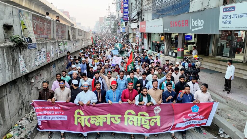 সারা দেশে নিষিদ্ধ ঘোষিত আওয়ামী লীগ কর্তৃক নাশকতা সৃষ্টির প্রতিবাদে এবং জুলাই সনদসহ সকল গণহত্যার বিচার ও জুলাই সনদের আইনি স্বীকৃতি প্রদানের দাবিতে বিক্ষোভ মিছিল করেছে বাংলাদেশ ইসলামী ছাত্রশিবির গাজীপুর মহানগর শাখা।
