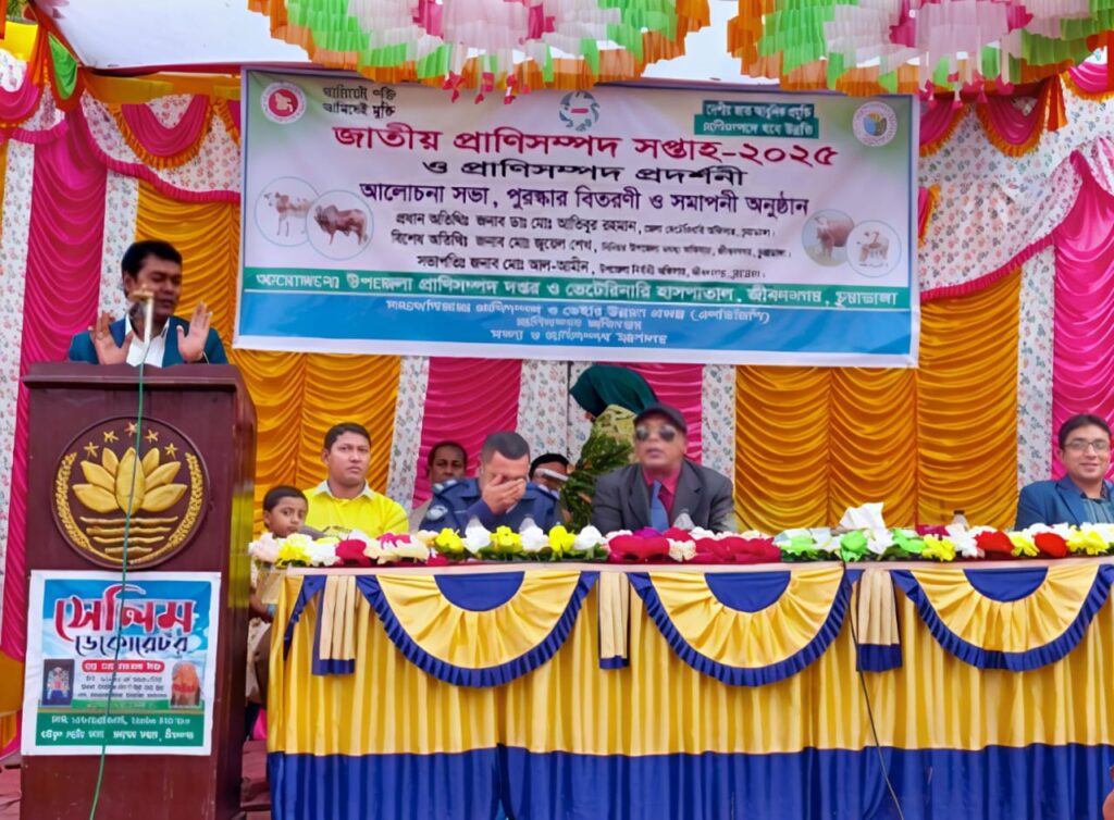 ‘দেশীয় জাত, আধুনিক প্রযুক্তি—প্রাণিসম্পদে হবে উন্নতি’ এই প্রতিপাদ্যকে সামনে রেখে চুয়াডাঙ্গা জেলায় পালিত হলো জাতীয় প্রাণিসম্পদ সপ্তাহ। জীবননগর উপজেলা প্রাণিসম্পদ দপ্তর ও ভেটেরিনারি হাসপাতালের উদ্যোগে আয়োজিত সপ্তাহব্যাপী এই অনুষ্ঠানের মধ্য দিয়ে স্থানীয় খামারি ও উদ্যোক্তাদের মাঝে নতুন উদ্দীপনা সৃষ্টি হয়েছে।
