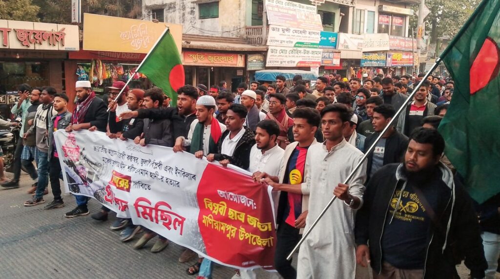 আবু রায়হান, মণিরামপুর প্রতিনিধি: যশোরের মণিরামপুরে শহীদ হাদির গায়েবানা জানাজা ও হত্যার বিচারের দাবিতে প্রতিবাদ কর্মসূচি পালন করা হয়েছে। শনিবার (২০ ডিসেম্বর) বিকেলে মণিরামপুর পৌরসভার সামনে গায়েবানা জানাজা নামাজ আদায় করা হয়।