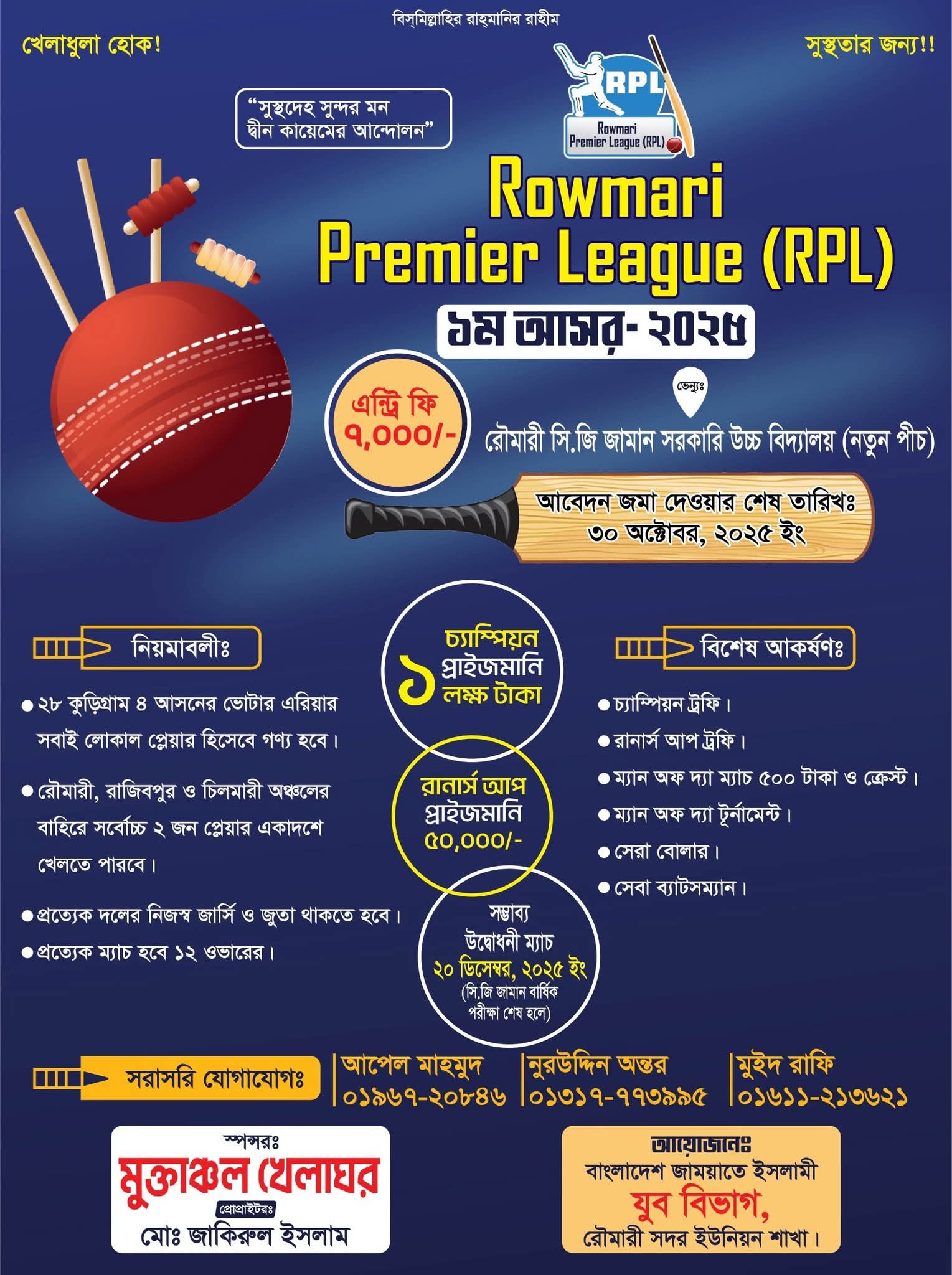 নতুন কলম নিউজ ডেস্কঃ রৌমারী বাসীদের জন্য একটি চমৎকার ক্রীড়া আয়োজন উপহার দিতে যাচ্ছে বাংলাদেশ জামায়াতে ইসলামী যুব বিভাগ, রৌমারী থানা শাখা। আয়োজিত হচ্ছে — “Rowmari Premier League (RPL)” ১ম আসর-২০২৫। 🏏 ...
